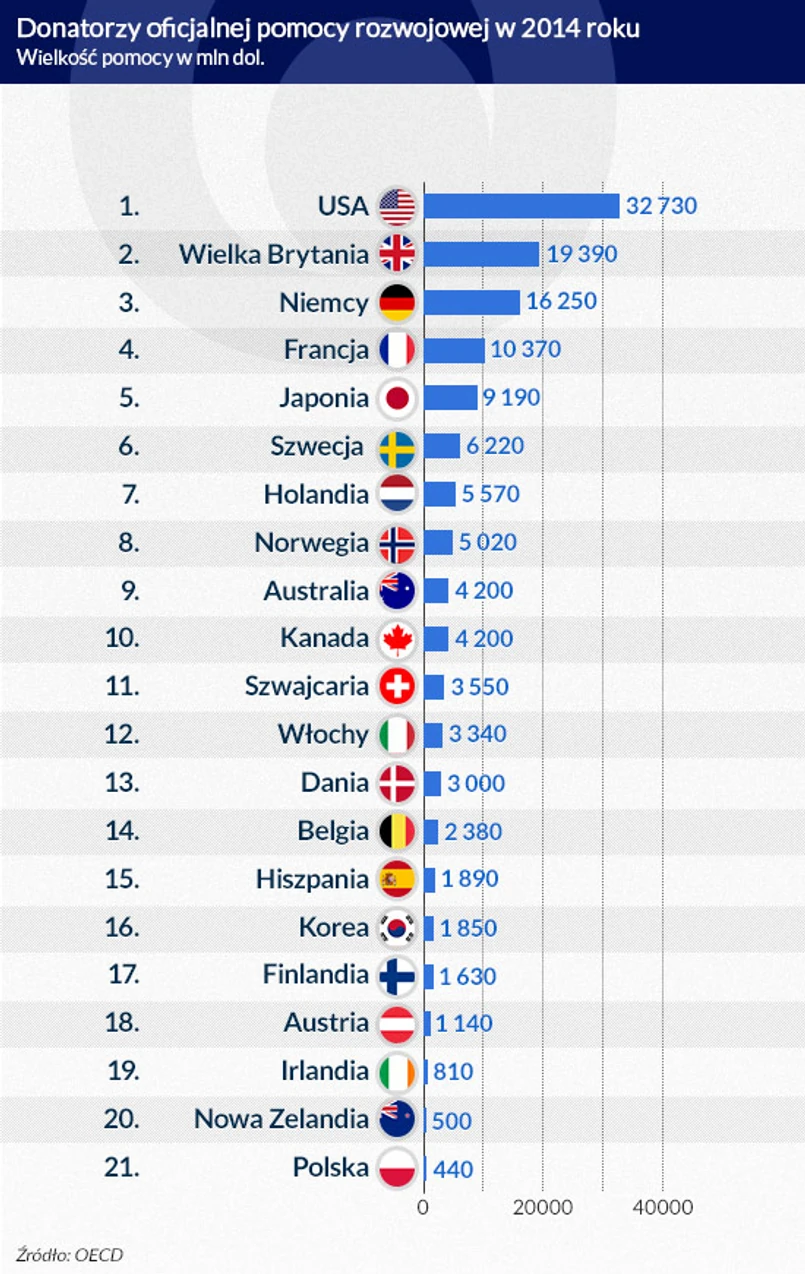 W 1970 r. Zgromadzenie Ogólne ONZ zaleciło, by kraje bogate przekazywały rocznie na pomoc 0,7 proc. swojego PKB. W 2005 r. Rada Europejska nałożyła na nowe kraje UE obowiązek wydawania na pomoc rozwojową do 2015 r. 0,33 PKB. Polska jest daleka od spełnienia tej powinności.