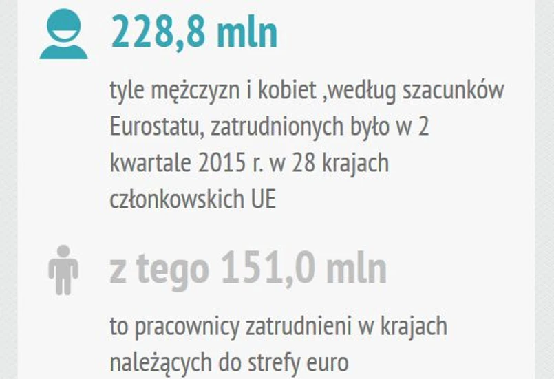 Eurostat szacuje, że w II kw. 2015 r. w całej UE zatrudnionych było 228,8 mln osób, w tym w strefie euro - 151 mln osób.