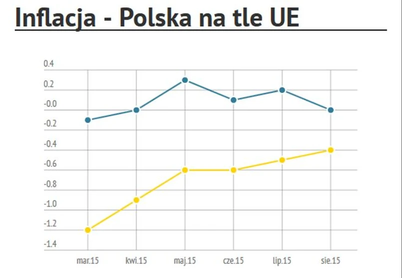 Według szacunków Eurostatu w sierpniu 2015 roku w całej Unii Europejskiej ceny pozostały na podobnym poziomie jak przed rokiem, roczna inflacja wyniosła 0,0 proc.
