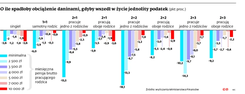 Resort finansów zapewnia jednak, że na jednolitym podatku Polacy nie stracą, bo wzór służący do jego obliczania bierze pod uwagę znikające ulgi i odliczenia. Tabelka, którą pokazujemy na grafice, pośrednio to potwierdza. Obciążenia daninami spadają we wszystkich grupach. Mechanizm wyliczania podatku powoduje, że procentowo najbardziej zyskują osoby zarabiające najmniej na osobę w rodzinie. Na przykład w przypadku rodziny, w której dwójka rodziców zarabia pensję minimalną, ten zapłacony podatek byłby aż o 18 pkt proc. niższy niż dziś. To m.in. efekt tego, że w nowym modelu koszt ubezpieczenia emerytalnego takich osób byłby praktycznie pokrywany przez budżet.
