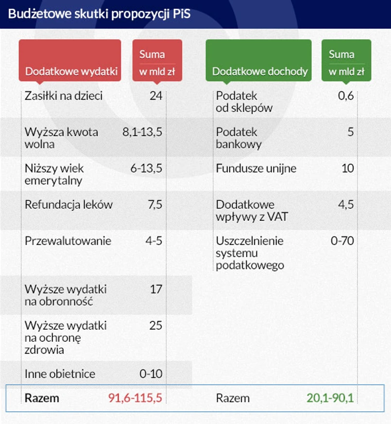 – Rozwiązanie problemu kredytów frankowych. PiS poparł ustawę przegłosowaną w Sejmie i zmienioną później w Senacie, przerzucającą na banki 90 proc. kosztów przewalutowania. Jeśli powróci po wyborach do tego pomysłu koszt dla banków wyniesie, według szacunków Związku Banków Polskich 20-25 mld zł. Ale koszty poniósłby także budżet. Bezpośrednim byłoby obniżenie wpływów z CIT o 4-5 mld zł. Pośrednie skutki, związane ze spowolnieniem gospodarczym, a tym samym spadkiem wpływów przede wszystkim z VAT byłyby bardziej dotkliwe. W dodatku Polska wdałaby się niemal na pewno w spory prawne z zagranicznymi centralami banków i ostatecznie koszt przewalutowania mógłby w całości ponieść budżet państwa.