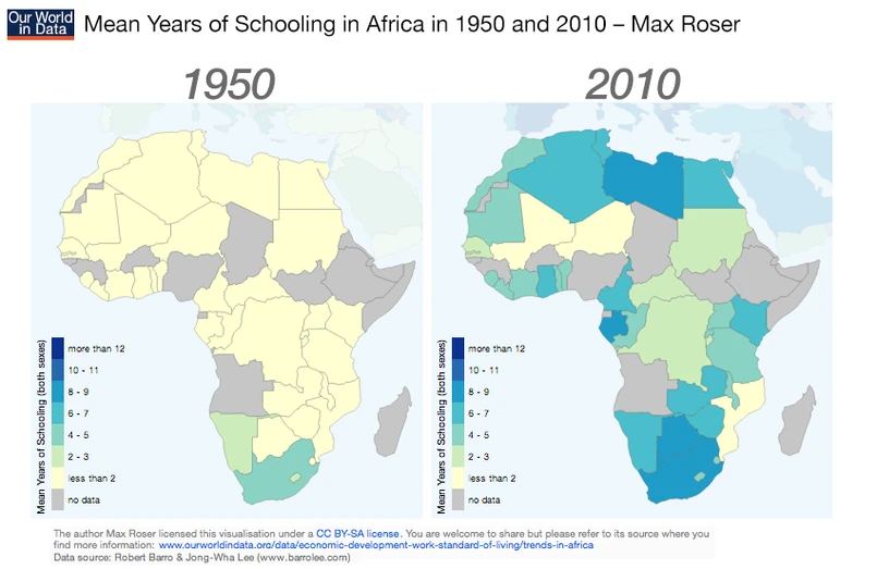 Najbardziej uderzającym korzystnym trendem na Czarnym Lądzie jest rozwój edukacji. Poniżej znajduje się mapa pokazująca, jak cały kontynent zaczął „chodzić” do szkoły: