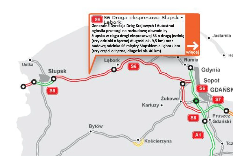 Drugi przetarg obejmuje budowę drogi ekspresowej S6 na odcinku Słupsk-Lębork z podziałem na 3 części: