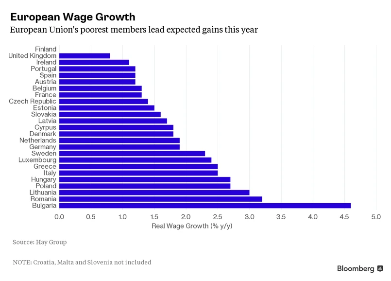 Dzięki wysiłkom rządu, płace rosną w całej gospodarce. Przeciętne miesięczne wynagrodzenie w Bułgarii wynosi teraz 868 lewów (495 dol.). Jeszcze rok temu było to 802 lewów. Pod względem tempa wzrostu zarobków skorygowanego o inflację, Bułgaria jest niekwestionowanym liderem UE. W tym roku dynamika ta sięgnie 4,6 proc. – wynika z prognoz firmy rekrutacyjnej Hay Group. Na drugim miejscu znajdzie się Rumunia, a na trzecim – Litwa. Polska z wzrostem 2,7-procentowym realnym wzrostem płac pasuje się na czwartej pozycji w UE.