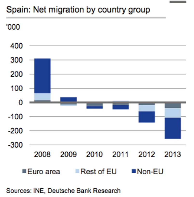 Hiszpania, która do 2010 roku miała dodatnie saldo migracji, od tamtego czasu notuje spadek wielkości populacji - w 2013 roku miała ujemne saldo (w stosunku do innych państw strefy euro) w wysokości 40 tys. osób – wynika z raportu ośrodka badawczego Deutsche Banku. Co gorsza, podczas gdy emeryci ciągle przybywają do Hiszpanii, dobrze zmotywowani i mający najlepsze wykształcenie młodzi coraz częściej opuszczają kraj. Trend ten występuje we wszystkich krajach basenu Morza Śródziemnego. Odsetek wysoko wykształconych imigrantów z Hiszpanii, Włoch, Grecji i Portugalii napływających do innych europejskich krajów wzrosła z 23 proc. (w latach 2005-06) do 51 proc. (lata 2011-12):