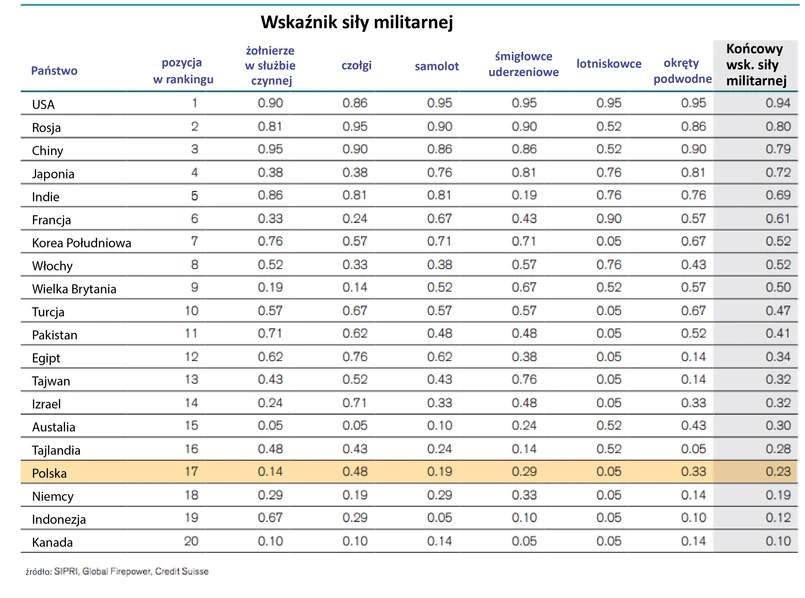W zestawieniu 20 najpotężniejszych armii na świecie znalazło się również miejsce dla Polski (0,23 pkt.), która zajęła miejsce 17. i wyprzedziła Niemcy (0,19 pkt.), Indonezję (0,12 pkt) oraz Kanadę (0.10 pkt.) Wysoko oceniono m.in. pancerny potencjał naszego wojska (0,48 pkt.) oraz potencjał okrętów podwodnych (0,33 pkt.). Z raportu Credit Suisse wynika natomiast, że Niemcy mają nad Polską przewagę w liczebności armii (0,29 pkt.), potencjale sił powietrznych (0,29 pkt.) oraz helikopterów bojowych (0,33 pkt.)
