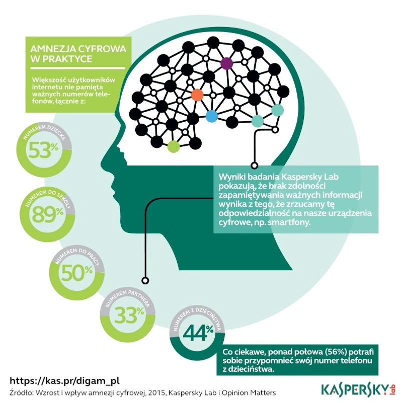 Jak wynika z raportu Kasperskiego, ponad połowa dorosłych internautów (ok. 60 proc.) pamięta dawnym numer telefonu do domu, w którym mieszkali w dzieciństwie. Jednak 53 proc. nie jest w stanie zapamiętać numeru telefonu swojego dziecka, a 51 proc. – numeru do swojego biura. Jedna trzecia ankietowanych nie potrafi wykręcić z pamięci numeru telefonu do swoich rodziców.