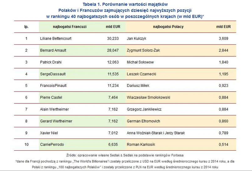 Średnia majątków 40 najbogatszych Francuzów wyniosła w 2014 roku ponad4,5 mld EUR. Polscy najbogatsi milionerzy (czterdziestu) przeciętnie posiadają o wiele mniej –538 mln EUR. Równie duża różnica jest pomiędzy medianą tych fortun. We Francji mediana wysokości majątków 40 najbogatszych obywateli wynosi 1 885 mln EUR, a w Polsce 238 mln EUR.