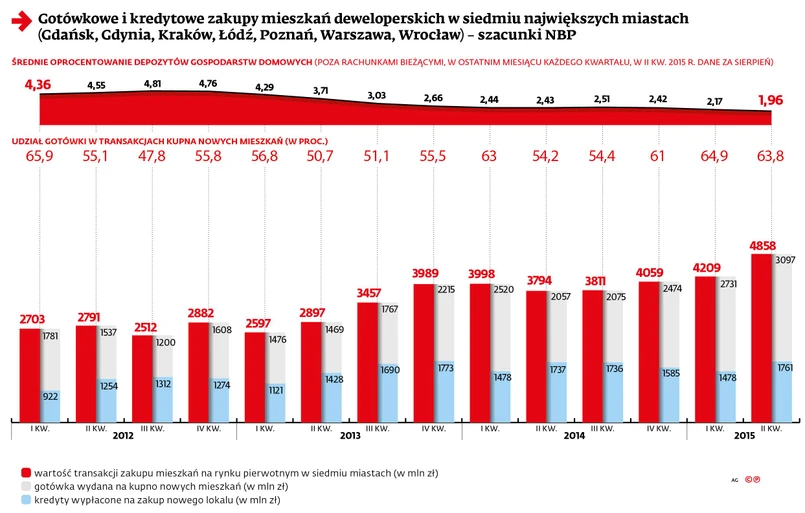 W sierpniu średnie oprocentowanie depozytów gospodarstw domowych wynosiło zaledwie 1,84 proc. Tymczasem w największych miastach można na wynajmie zarobić rocznie ok. 4–5 proc. wartości wynajmowanego mieszkania. Rekordowe zakupy gotówkowe mieszkań to także skutek rosnących wymogów co do wkładu własnego przy kredytach. W tym roku wynosi on minimum 10 proc., przy czym część banków wymaga wkładu jeszcze wyższego.