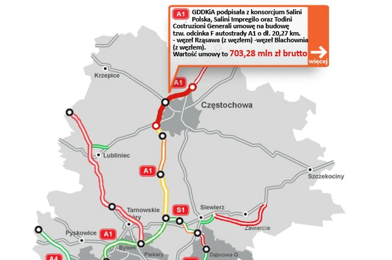 Generalna Dyrekcja Dróg Krajowych i Autostrad (GDDKiA) podpisała z konsorcjum Salini Polska, Salini Impregilo oraz Todini Costruzioni Generali umowę na budowę tzw. odcinka F autostrady A1 - węzeł Rząsawa (z węzłem) - węzeł Blachownia (z węzłem). Wartość umowy to 703,28 mln zł brutto, podała Dyrekcja. Długość odcinka F to 20,27 km.