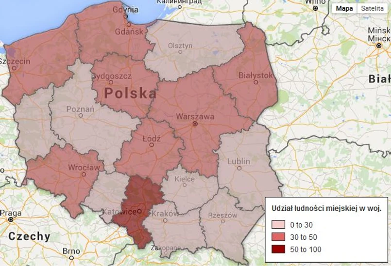Z danych Eurostatu wynika, że Polska należy do państw, w których przeważa ludność zamieszkująca tereny słabo zaludnione. W 2014 roku w Polsce tereny wiejskie zamieszkiwało 41,1 proc. ludności, podczas gdy w dużych miastach mieszkało 35,2 proc. populacji. Najgęściej zaludnionym regionem jest woj. śląskie, gdzie w miastach żyje ponad połowa populacji.