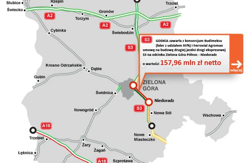 "Konsorcjum (...) podpisało z Generalną Dyrekcją Dróg Krajowych i Autostrad Oddział w Zielonej Górze umowę na budowę drugiej jezdni drogi ekspresowej S3 na odcinku Sulechów - Nowa Sól: drugi odcinek od km 286+043 do km 299+350. (...) Termin rozpoczęcia robót: data zawarcia umowy. Termin zakończenia robót: 22 miesiące od daty zawarcia umowy. Do czasu realizacji nie wlicza się okresów zimowych (tj. od 15 grudnia do 15 marca)" - czytamy w komunikacie.