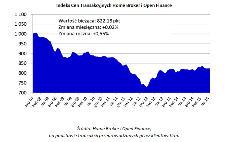 Indeks Cen Transakcyjnych Home Broker i Open Finance wzrósł w ostatnim miesiącu o 0,02 proc. do poziomu 822,18 pkt, co oznacza wzrost o 0,55 przez ostatni rok. Od czerwca 2013 r. indeks porusza się w przedziale 800-820 pkt, sytuacja na rynku mieszkaniowym jest w skali kraju stabilna. W ostatnich czterech miesiącach wskaźnik nie zmienił się bardziej niż o ułamki procent, co można wiązać z okresem wakacyjnym. Do małego ożywienia może dojść pod koniec roku.