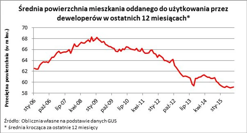 Po takim przetworzeniu dane publikowane przez GUS pokazują, że w szczytowym momencie (październik 2008 r.) przeciętna powierzchnia mieszkania oddawanego do użytkowania przez deweloperów wyniosła 68,3 m kw. Dziś – po prawie 7 latach – przeciętny metraż zmalał do 59,2 m kw. (średnia dla okresu od września 2014 r.- do sierpnia 2015 r.). Jest to także jeden z najniższych wyników w historii badania (stosowne dane są dostępne od 2006 r.). Mieszkania o najmniejszej powierzchni deweloperzy oddawali do użytkowania w czerwcu 2015 r. Miały one przeciętną powierzchnię 59 m kw., a więc jedynie o 0,2 m kw. mniej niż najnowszy wynik - z sierpnia 2015 r.