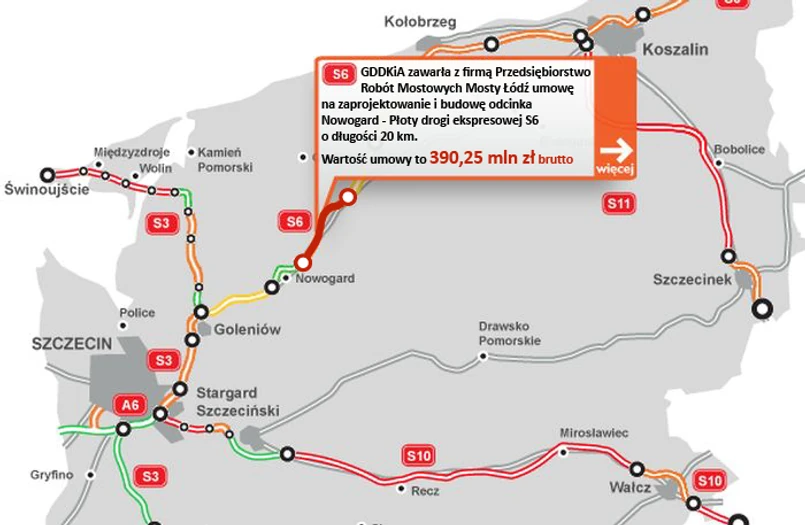 W pozostałych przetargach na S6 w zachodniopomorskim najkorzystniejsze oferty miały: Budimex (odcinki Goleniów - Nowogard i Płoty - Kiełpino), konsorcjum Polaqua i Dragados (Kiełpino - Kołobrzeg Zachód), Porr Polska Infrastructure (Kołobrzeg Zachód – Ustronie Morskie) i konsorcjum spółek Strabagu (Ustronie Morskie - początek obwodnicy Koszalina i Sianowa).