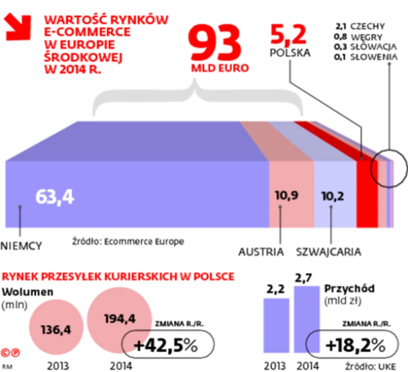 W Polsce rynek e-handlu rośnie z roku na rok w tempie dwucyfrowym. W 2014 r. osiągnął wartość ponad 5 mld euro. Do tego w Polsce wciąż niski (51,7) jest wskaźnik postażu, czyli średniej liczby przesyłek na mieszkańca. Dla porównania w Niemczech czy Wielkiej Brytanii wskaźniki te wynoszą odpowiednio 218 i 266.