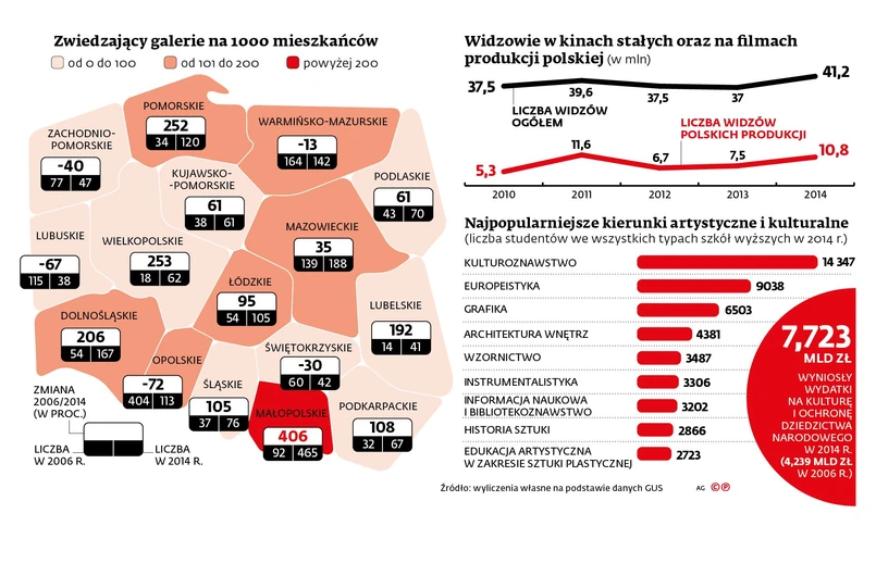 W skali ogólnopolskiej cieszyć może fakt, że na przestrzeni ostatnich lat częściej korzystamy niemal ze wszystkich dóbr kulturalnych. Rzadziej zaglądamy jedynie do bibliotek. Wyraźny wzrost odwiedzających zanotowała większość teatrów, kin, muzeów i galerii. I choć do instytucji zaglądamy częściej, to poziom wydatków na kulturę wciąż jest u nas bardzo niski. Przeciętny Polak na bilet do kina lub wejściówkę do muzeum czy teatru w ciągu roku wydaje niecałe 25 zł. To ok. 1 proc. przeciętnego miesięcznego wynagrodzenia netto.