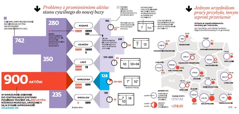 Wyliczenia MSW nie pozostawiają złudzeń – sytuacja w największych i przez to najbardziej obleganych USC w kraju jest fatalna. W Warszawie dziennie do centralnego systemu powinno trafiać ok. 900 aktów różnego rodzaju. Urzędnicy są w stanie wprowadzić zaledwie 128. W Krakowie zapotrzebowanie dzienne wynosi 742 akty, a do bazy trafia 336. Z reguły wprowadzenie jednego aktu do bazy zajmuje 20–25 minut. Największy rozstrzał wskazała Warszawa, której zajmuje to od 20 minut do nawet 2 godzin.