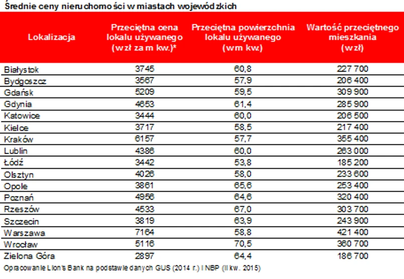 Statystyczne mieszkanie w mieście wojewódzkim ma 60,4 m kw. i jest warte ponad 310 tys. zł (średnia ważona powierzchnią lokali). W poszczególnych miastach sytuacja jest jednak bardzo zróżnicowana – wynika z szacunków Lion’s Banku. Na jednym biegunie są takie miasta jak Łódź, Kraków czy Bydgoszcz, gdzie przeciętne „M” jest relatywnie niewielkie, a na drugim Opole, Rzeszów i Wrocław, gdzie sytuacja jest znacznie lepsza niż średnia.