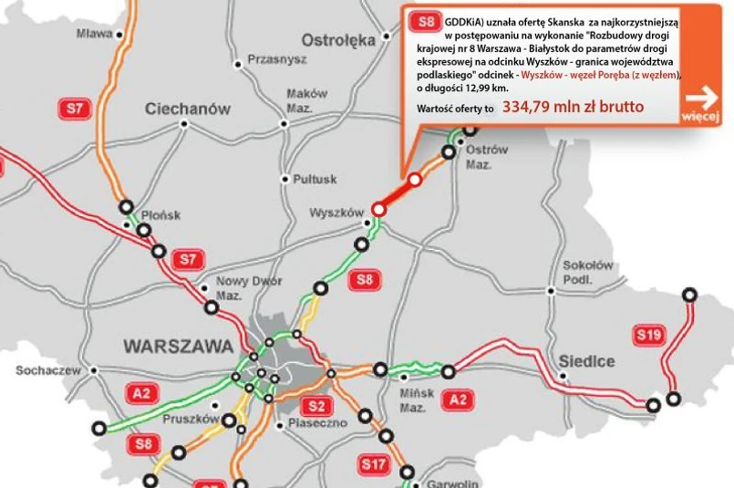 Generalna Dyrekcja Dróg Krajowych i Autostrad (GDDKiA) uznała ofertę Skanska, wartą 334,79 mln zł brutto, za najkorzystniejszą w postępowaniu na wykonanie "Rozbudowy drogi krajowej nr 8 Warszawa - Białystok do parametrów drogi ekspresowej na odcinku Wyszków - granica województwa podlaskiego" - odcinek Ia - Wyszków - węzeł Poręba (z węzłem), o długości 12,99 km, podała Dyrekcja.
