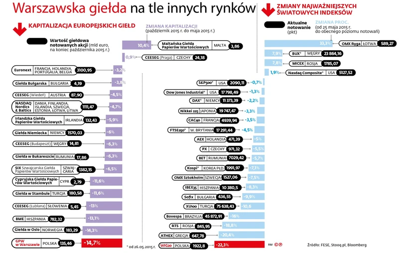 Od końca maja, gdy nastąpił pierwszy etap zmiany władzy (Andrzej Duda wygrał wybory prezydenckie), Warszawski Indeks Giełdowy spadł o prawie 14 proc., a WIG20 stracił ponad jedną piątą. Kapitalizacja GPW, czyli łączna wartość rynkowa wszystkich spółek, stopniała w tym czasie o niemal 15 proc. To jeden z największych spadków w Europie.