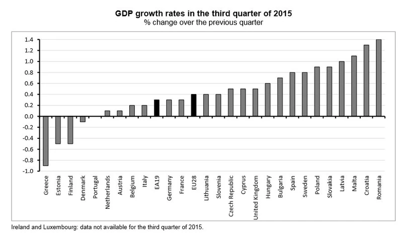 W porównaniu z poprzednim kwartałem, w trzecim kwartale najszybciej rozwijały się gospodarki Rumunii (1,4 proc. wzrostu PKB), Chorwacji (1,3 proc.), Malty (1,1 proc.), Łotwy (1 proc.) oraz Polski i Słowacji (po 0,9 proc.). Spadek PKB zanotowano w Grecji (-0,9 proc.), Estonii i Finlandii (po -0,5 proc.) oraz Danii (-0,1 proc.).