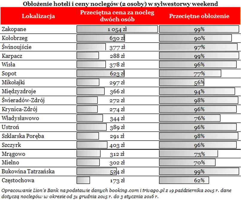 Do prawdziwego oblężenia dojdzie jednak dopiero w sylwestrowy weekend (31.12.1205 – 3.01.2016). We wcześniej wspomnianym Zakopanem już dziś obłożenie hoteli szacowane jest na 99 proc. To oznacza, że dostępny do wynajęcia jest tylko jeden pokój hotelowy na 100. Fakt, że oferta jest mocno przebrana, skutkuje też wysoką średnią stawką za dobę. Dla dwóch osób jeden nocleg w tym terminie oznacza średni wydatek przekraczający 1054 zł za dobę – to prawie trzy razy więcej niż w okresie świąt Bożego Narodzenia. Wysokie są też stawki w znajdującej się niedaleko Bukowinie Tatrzańskiej (524 zł za dobę). Wolny pokój w tej lokalizacji to rzadko spotykane zjawisko – obłożenie wynosi 99 proc. czyli znalezienie wolnego miejsca jest niemal niemożliwe.