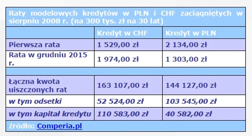 Raty kredytów we frankach stały się wyższe niż w momencie podpisania przez kredytobiorców umów, a dziś przewyższają także raty kredytów w złotych. – Najczęściej spotykanym argumentem jest to, że frankowicze łącznie zapłacili mniej niż osoby z kredytami w złotych – nie jest on już tak oczywisty. Porównując ze sobą raty modelowych kredytów w złotych i frankach zaciągniętych w sierpniu 2008 r., wówczas frank kosztował nawet poniżej 2 zł, a boom na kredyty frankowe był największy, okazuje się, że frankowicze zapłacili niemal 20 tys. zł więcej, co prawda dużo mniej odsetek, a znacznie więcej kapitału kredytu – komentuje Mikołaj Fidziński, analityk Comperia.pl.