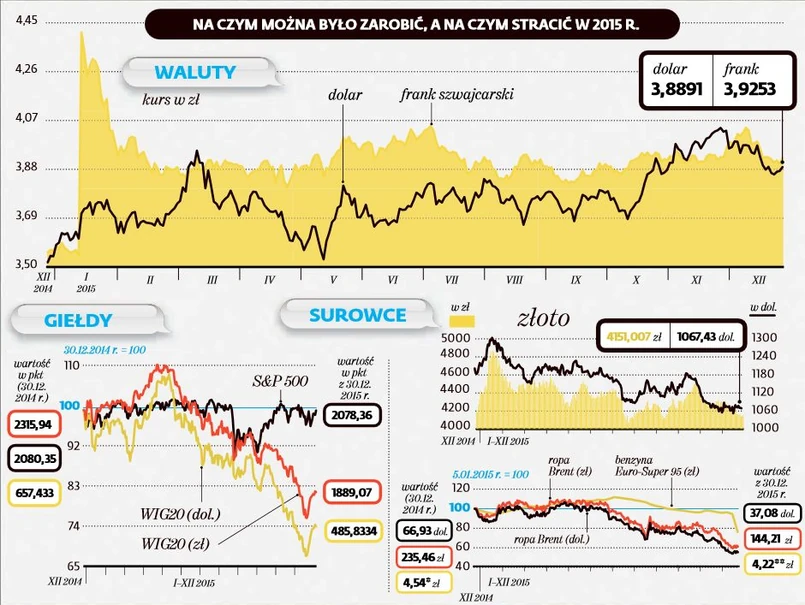 Wśród walut specjaliści nadal stawiają na dolara, ale i na funta brytyjskiego, które były mocne już w 2015 r. W ocenie ekspertów największe jest prawdopodobieństwo, że w 2016 r. wzrost wartości obejmie te aktywa, które w 2015 r. wypadły źle. Dotyczy to np. akcji. Polska giełda, z niemal 20-proc. spadkiem, była w 2015 r. jedną z najgorszych na kontynencie. Teraz ma być inaczej, bo – mimo obaw – w 2016 r. mają się utrzymać dobre trendy w naszej gospodarce, a akcje są bardzo przecenione. Taniały zresztą na większości rynków, choć były i takie parkiety, które poszły w górę.