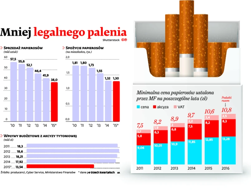 Rok 2015 był kolejnym, w którym rynek legalnych papierosów się kurczył. Po 11 miesiącach opodatkowana sprzedaż wyniosła 38 mld sztuk, co oznacza spadek o ponad 1 mld sztuk w porównaniu z tym samym okresem 2014 r. Wprawdzie w III kwartale odnotowano niewielki wzrost sprzedaży o 2,5 proc. (0,28 mld sztuk w porównaniu z tym samym okresem poprzedniego roku) będący skutkiem okresowych akcji promocyjnych na wybrane marki z segmentu popularnego i średniego, wprowadzonych przez większość producentów. Mimo odnotowanej chwilowej poprawy sytuacja branży ciągle daleka jest od stabilizacji. Od 2008 r. największy spadek zanotowano w segmencie popularnych marek papierosów (najtańszych marek), które stanowią 60 proc. rynku papierosów w Polsce. Ich klienci są najbardziej wrażliwi na cenę. Podwyżki skłaniają ich do przejścia do szarej strefy, gdzie mogą kupić paczkę papierosów z przemytu za 6–7 zł, a 20 papierosów wytworzonych z nielegalnego, nieopodatkowanego tytoniu zaledwie za 2–3 zł. W efekcie szara strefa wynosi już około 30 proc. rynku wyrobów tytoniowych.