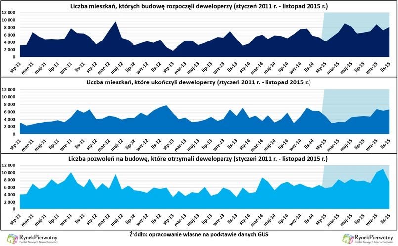 Po dokładniejszym sprawdzeniu danych GUS-u możemy wywnioskować, że przez dziesięć miesięcy 2015 r. deweloperzy rozpoczęli więcej mieszkań niż w całym 2014 r. Podobna sytuacja dotyczyła również uzyskanych pozwoleń na budowę. Po uwzględnieniu wyników z jedenastu miesięcy 2015 r. okazuje się, że od stycznia do grudnia 2014 roku, liczba nowych pozwoleń była niższa o 11%. Podobna różnica dla 2013 r. wynosi aż 36%.