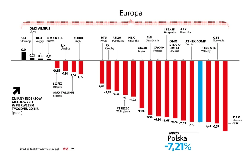 Niewielkie piątkowe wzrosty na chińskich giełdach nie zmieniają faktu, że początek roku jest rzeczywiście fatalny. W Chinach w dwóch z czterech pierwszych dni giełdowych zawieszano notowania, bo spadki osiągnęły maksymalny dopuszczalny poziom. To przełożyło się na inne parkiety – nowojorski indeks Dow Jones spadł w ciągu pierwszych czterech dni o 5,2 proc., co jest najgorszym początkiem roku w historii. To samo stało się z MSCI All-Country World Index, wskaźnikiem grupującym wszystkie główne parkiety świata, zarówno w krajach rozwiniętych, jak i na rynkach wschodzących.