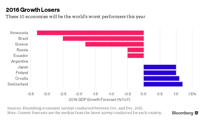Zwycięzcą niechlubnego rankingu będzie w nadchodzącym roku Wenezuela. PKB tego bazującego na produkcji ropy kraju zmniejszy się o 3,3 proc. – wynika z analizy przeprowadzonej dla 93 krajów przez Bloomberga. Tuż za nią znajdą się obciążona śmieciowymi ratingami Brazylia (minus 2,5 proc.), zmagająca się z długiem Grecja (minus 1,8 proc.) oraz opustoszała z towarów Rosja (minus 0,5 proc.). Pod kreską znajdzie się jeszcze Ekwador (minus 0,5 proc.).