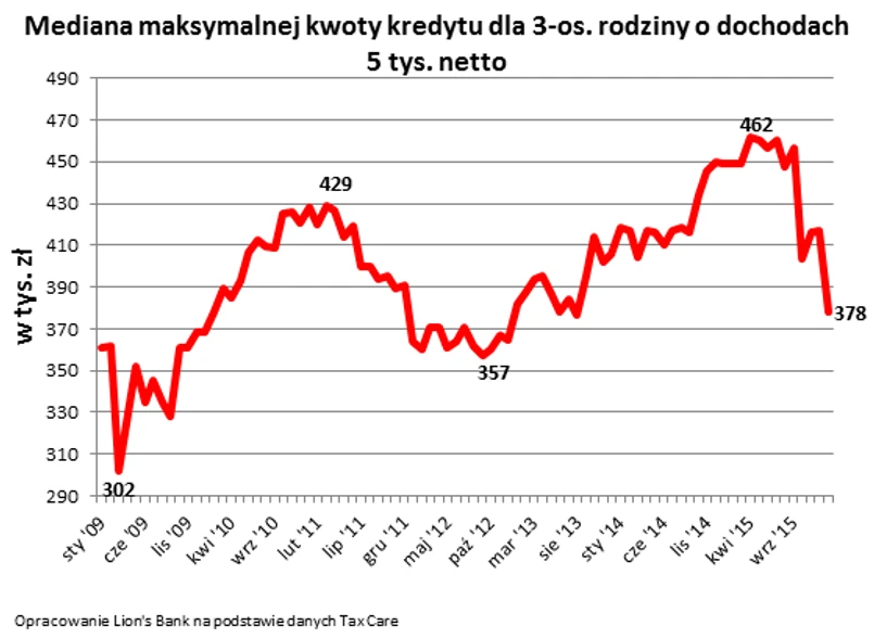 Trzyosobowa rodzina dysponująca dochodem na poziomie 5 tys. zł netto może pożyczyć 377,8 tys. zł (mediana) w formie 30-letniego kredytu – wynika z najnowszych danych zebranych przez Lion’s Bank. Jest to najniższy wynik od ponad 2 lat. W ciągu miesiąca przeciętna zdolność kredytowa modelowej rodziny spadła aż o ponad 39 tys. zł, podczas gdy w ciągu roku zmalała ona o 71 tys. zł.