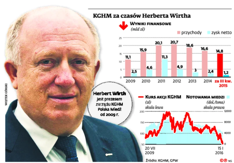 Mimo że miedziowy gigant był za kadencji Wirtha mocno zaangażowany w finansowanie innowacyjnych przedsięwzięć, co znakomicie wpisywało się w rządowe strategie, to trudno powiedzieć, by prezes był pieszczochem rządu. Wprowadzony w 2012 r. podatek od kopalin, którym w praktyce obłożony jest tylko KGHM, kosztuje koncern ponad 1 mld zł rocznie. Ten podatek plus spadające ceny miedzi przez ostatnie miesiące coraz bardziej ciążą spółce – tylko przez ostatnie pół roku jej giełdowa wycena stopniała o połowę. W ostatni piątek – w reakcji na kolejne minima cen miedzi – kurs spadał o ponad 5 proc.