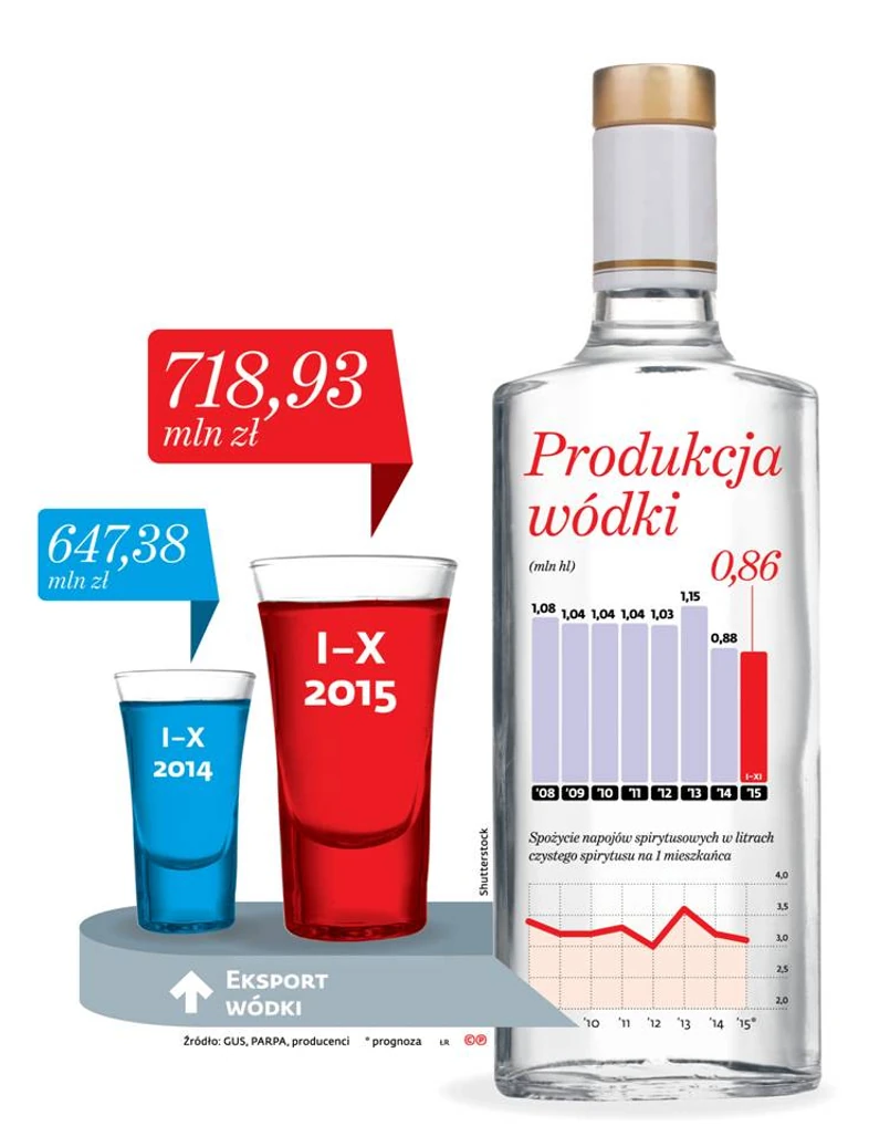 – Dla uzyskania prawdziwego obrazu rynku ubiegły rok należałoby zestawić z 2012 r., gdy produkcja przekraczała 100 mln litrów. W takim układzie odniesienia ciągle nie wydostaliśmy się z dołka – komentuje prezes Związku Pracodawców „Polski Przemysł Spirytusowy” Leszek Wiwała. Wyjątkowo słaby okazał się rok 2014, dlatego że w I kw. produkcja wódki została niemal wstrzymana. Powód: 15-proc. podwyżka akcyzy. Producenci, by ograniczyć straty, wyprodukowali więcej alkoholu pod koniec 2013 r., przez co dane za ten okres również nie są reprezentatywne.