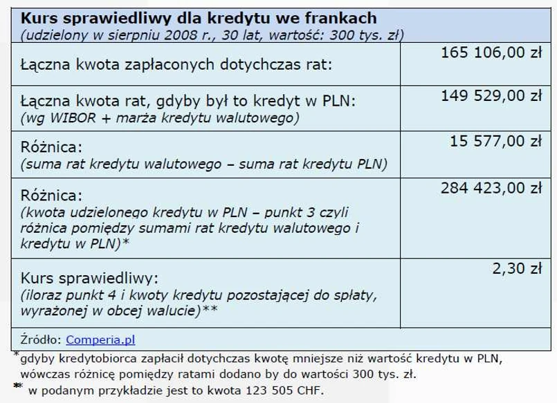 - Dzięki temu kursowi będzie można skorzystać z przewalutowania kredytu na polską walutę. Po drugie, jeśli bank nie pójdzie na taką formę restrukturyzacji długu, to kredyt dalej będzie walutowy, ale już spłacany po kursie sprawiedliwym. To dużo lepsze rozwiązanie, bowiem skorzysta się na nim podwójnie – zarówno na niskim kursie sprawiedliwym, jak i na niewielkim oprocentowaniu kredytu walutowego, dużo niższym niż kredytu w złotych, jakie miałby przewalutowany kredyt. – komentuje Mikołaj Fidziński, Comperia.pl.