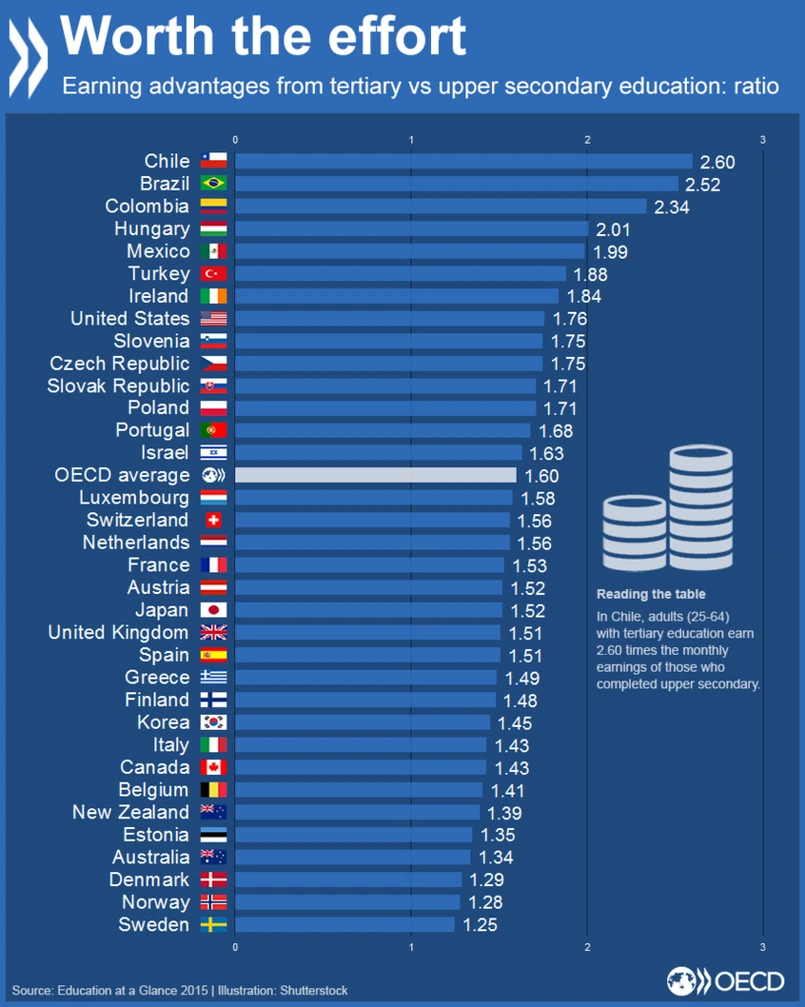Jak wynika z raportu „Education at Glance 2015”, w państwach OECD dorośli z wykształceniem ponadgimnazjalnym zarabiają średnio o 23 proc. więcej niż osoby z niższym wykształceniem. Pracownicy z wykształceniem policealnym otrzymują 12 proc. więcej, a absolwenci studiów (od licencjackich w górę) dostają już aż o 60 proc. wyższe pensje. Największe korzyści z inwestycji w naukę czerpią posiadacze tytułów magistra lub doktora. Średnio w krajach OECD zarabiają oni ponad 2 razy więcej w porównaniu z osobami, które ukończyły szkołę średnią.