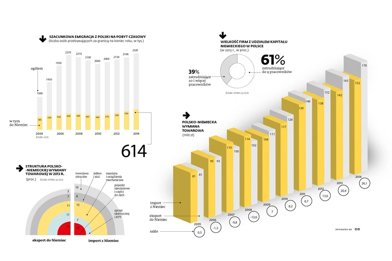 Ostatnie słowne spięcia na linii Warszawa– –Berlin nie zmieniają faktu, że pod względem gospodarczym oba kraje są dla siebie ważnymi partnerami. Niemcy są największym odbiorcą naszego eksportu i pochodzi stamtąd najwięcej towarów kupowanych przez Polskę. Od lat są też faktycznie największym inwestorem w Polsce (w 2014 r. zostały wprawdzie wyprzedzone przez Holandię, ale kraj ten z racji łagodnego reżimu podatkowego dla wielu firm służy tylko jako adres pocztowy, więc prawdziwie holenderskie inwestycje są mniejsze).