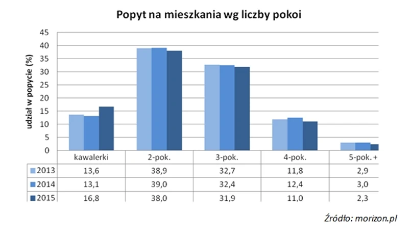 Na uwagę zasługuje fakt, że w porównaniu z analogicznymi okresami 2014 i 2013 rok, udział klientów na zakup kawalerki w całkowitym popycie na mieszkania wzrósł.