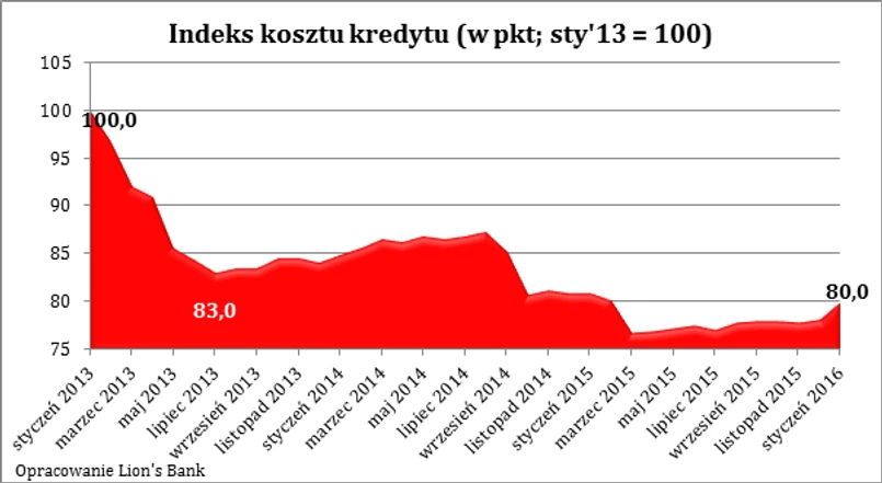 Wszystko dlatego, że aż 10 z 16 przebadanych banków zadeklarowało w styczniu, że żądają wyższego oprocentowania kredytu niż jeszcze miesiąc wcześniej. W efekcie dziś średnia marża kredytowa dla 3-osobowej rodziny z dochodem 5 tys. zł netto, która chciałaby się zadłużyć na 30 lat z jak najniższym wkładem własnym wynosi ponad 2%, podczas gdy w grudniu 2015 roku szacowana była na około 1,7%.