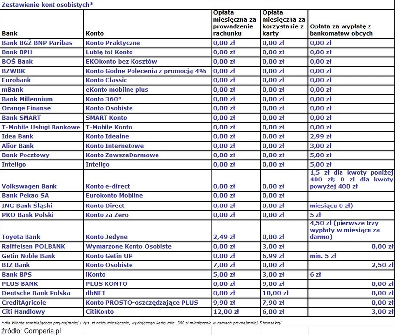 Analitycy Comperia.pl przygotowali zestawienie standardowych kont osobistych. Wyboru dokonano na podstawie wyboru jednego z oferty każdego banku dla klienta zarabiającego przynajmniej 1 tys. zł netto miesięcznie, wydającego kartą min. 300 zł miesięcznie w ramach przynajmniej 5 transakcji. Zestawienie uwzględnia opłatę miesięczną za prowadzenie konta, za korzystanie z karty i za wypłaty z obcych bankomatów. Wszędzie przelewy internetowe są darmowe.