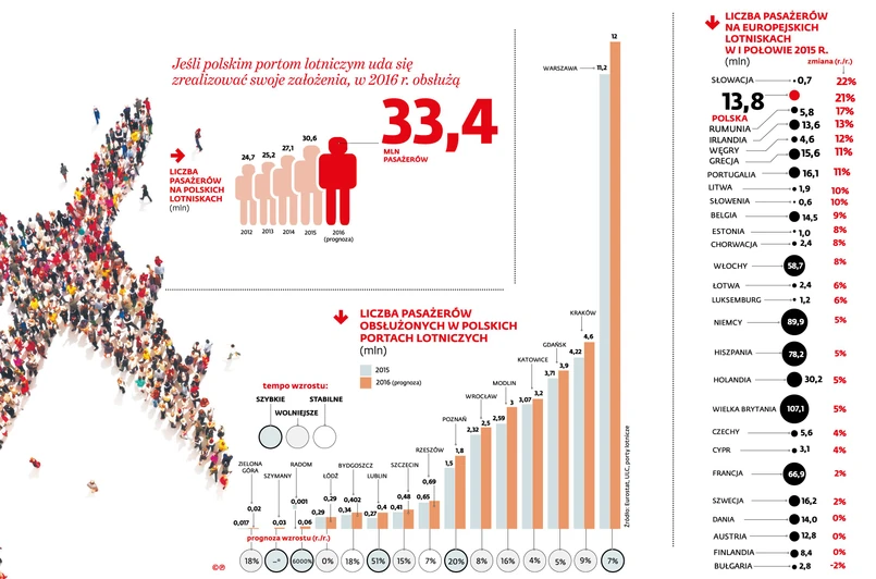 Warszawa zakłada minimalną poprawę ubiegłorocznego tempa wzrostu i celuje w 12 miliony wynik. Według prognoz, wolniej niż w ubiegłym roku będą rosnąć lotniska w Gdańsku, Katowicach, Wrocławiu, Krakowie i Modlinie. Z kolei Poznań, który w ubiegłym roku zwiększył obsługę pasażerów o 4 proc., tym razem chce zanotować aż 20 proc. wzrost. Stabilizację wzrostu zapowiadają tylko Bydgoszcz i Rzeszów, a jedynym portem, który nie spodziewa się większej liczby pasażerów jest Łódź. Aby sprostać napływowi pasażerów, kilka portów przewiduje inwestycje. W najbliższych miesiącach rozpocznie się rozbudowa terminalów w Lublinie i Modlinie, a rozpoczęte już rozbudowy mają zakończyć Bydgoszcz i Kraków. Modlin przewiduje ponadto budowę nowej wieży kontroli ruchu lotniczego.