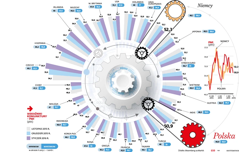 Nie tylko w naszym kraju początek roku przyniósł osłabienie w przemyśle. Indeks PMI spadł również w strefie euro, w tym u naszego najważniejszego partnera handlowego, czyli w Niemczech. Na świecie największe zaniepokojenie budzi kondycja przemysłu w Chinach, gdzie indeks znajduje się blisko kilkuletnich minimów i jest poniżej 50 punktów, co wskazuje na recesję w chińskim przemyśle.