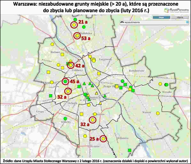 Jeśli dodatkowo uwzględnimy wydatki związane z wykończeniem lokali, to okaże się, że bardziej realna stawka za wybudowanie 1 mkw. mieszkania wyniosłaby 3500 zł/mkw. - 4000 zł/mkw. Taka wartość jest już mniej atrakcyjna w porównaniu do aktualnych cen metrażu (zwłaszcza na terenie mniejszych miast oraz Łodzi i Katowic). Powstaje również pytanie, czy Skarb Państwa dysponuje odpowiednimi działkami w okolicy metropolii przyciągających młodych Polaków. W tej kwestii raczej trudno będzie liczyć na pomoc samorządów. Władze największych miast posiadają ograniczony zasób większych działek budowlanych i niechętnie pozbywają się gruntów stanowiących rezerwę finansową – tłumaczy analityk portalu RynekPierwotny.pl. Dobrym przykładem jest Warszawa. Na poniższej mapie zaznaczono wszystkie niezabudowane działki o powierzchni powyżej 20 arów, które stołeczny magistrat zakwalifikował jako przeznaczone do zbycia lub zaplanowane do zbycia. Na początku lutego 2016 roku, w całej Warszawie można było znaleźć tylko siedem takich gruntów.