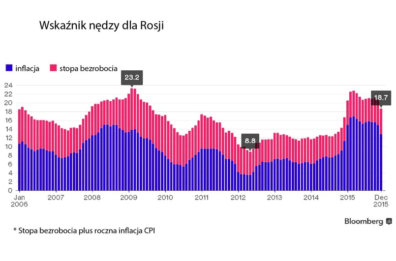 Wskaźnik nędzy po raz pierwszy wyliczono w 1970 roku, w erze stagflacji i wysokiego bezrobocia. Jednak dziś indeks ten nadal może być użytecznym narzędziem do zbadania takich państw jak Rosja, które są nadmiernie uzależnione od jednego dobra. Rosja ma czwarty najwyższy odczyt wskaźnika ubóstwa wśród największych gospodarek rynków wschodzących. Roczna stopa inflacji? Prawie 13 proc. Bezrobocie? Blisko 6 proc.