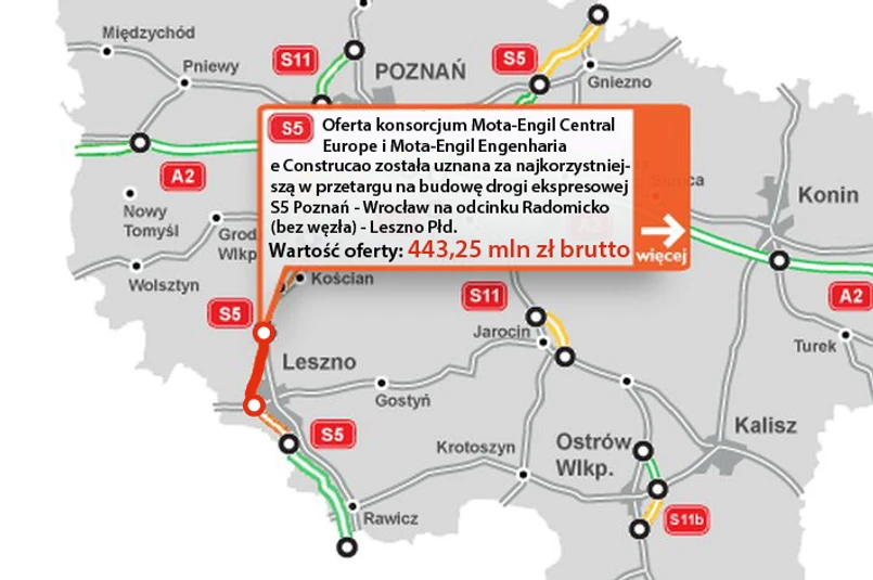 Oferta konsorcjum Mota-Engil Central Europe i Mota-Engil Engenharia e Construcao, warta 443,25 mln zł brutto, została uznana za najkorzystniejszą w przetargu na budowę drogi ekspresowej S5 Poznań - Wrocław na odcinku Radomicko (bez węzła) - Leszno Płd., podała Generalna Dyrekcja Dróg Krajowych i Autostrad (GDDKiA).