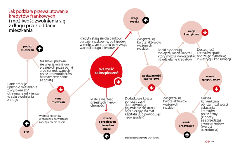 „W horyzoncie rocznym, biorąc pod uwagę inne czynniki wpływające na wyniki finansowe banków, wprowadzenie analizowanego projektu ustawy skutkowałoby powstaniem straty w skali sektora krajowych banków komercyjnych: 36 mld zł w wariancie I i 30 mld zł w wariancie II” – podsumowuje NBP. Wylicza, że ponoszące straty instytucje miałyby ok. 70-proc. udział w aktywach całego systemu bankowego. Obecnie jest to poniżej 2 proc. W skali sektora nastąpiłby spadek funduszy własnych rzędu 23–27 proc.