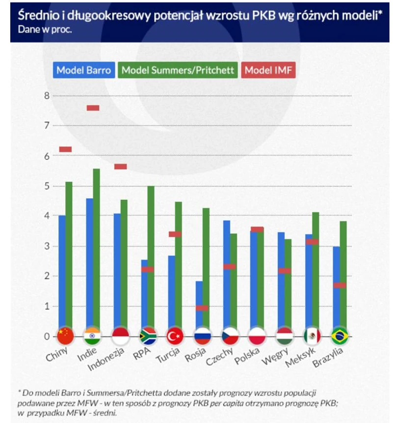 Wielu ekonomistów kwestionuje jednak ten optymizm. Ostatnio Robert Barro, który zasłynął badaniami nad wzrostem gospodarczym, opublikował badanie, w którym ostrzega, że Chiny mogą długookresowo rozwijać się w tempie 4 proc. lub niżej (3,5 proc. per capita, ale do tego trzeba dodać wzrost ludności, który przez najbliższą dekadę powinien być dodatni) – wobec ponad 6 proc., jakie przewiduje MFW i 6,5 proc. zakładanych przez rząd w Pekinie. Niedawno podobne badanie opublikowali Lawrence Summers (ten od hipotezy sekularnej stagnacji) i Terry Pritchett. Twierdzą oni, że generalnie prognozy dotyczące dużych krajów azjatyckich są zbyt optymistyczne.