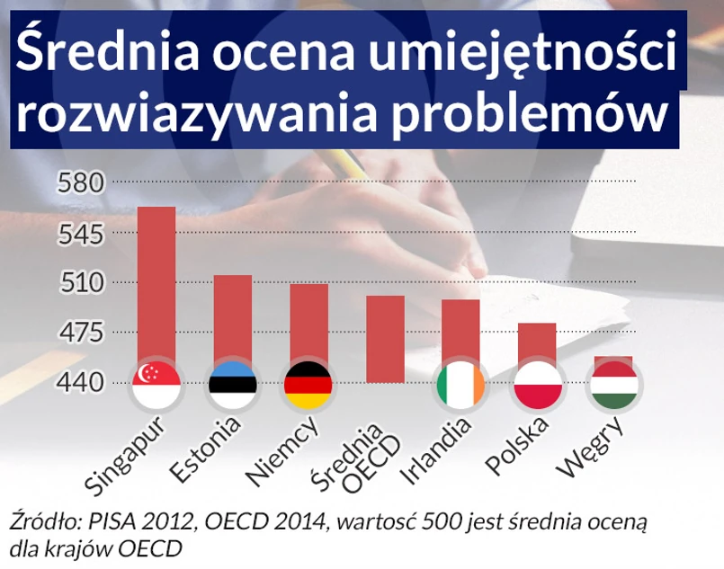 Reformy edukacji spowodowały, że postęp następuje. Potwierdzają to między innymi wyniki polskich 15-latków w ogólnoświatowym teście PISA. Rzeczony test pokazuje jednak, że polscy uczniowie słabiej od swoich rówieśników wypadają w części dotyczącej rozwiązywania problemów. Być może dlatego, że o ile matematyki, czytania, ortografii można nauczyć się samemu wykorzystując przekazywaną przez nauczyciela wiedzę, o tyle rozwiązywanie problemów to umiejętność, którą ćwiczy się rzadziej, bo wymaga współpracy, a na to w polskiej szkole nie ma ani czasu, ani pomysłu.